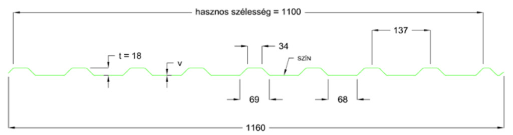 • 1 tábla teljes szélessége: 0,4 és 0,45 mm esetén 1120 mm – 0,5 és 0,6 mm esetén 1160 mm