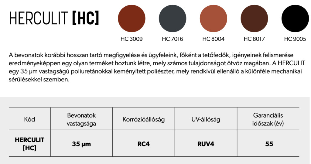Európa legjobb kohói számára piacvezető lakkokat gyártó üzemmel együtt kidolgozott bevonat. A korábbi bevonatok hosszan tartó megfigyelése és ügyfeleink, főként a tetőfedők, igényeinek felismerése eredményeképpen egy olyan terméket hoztunk létre, mely számos tulajdonságot ötvöz magában. A HERCULIT [HC] egy 35 μm vastagságú poliuretánokkal keményített poliészter, mely rendkívül ellenálló a különféle mechanikai sérülésekkel szemben.